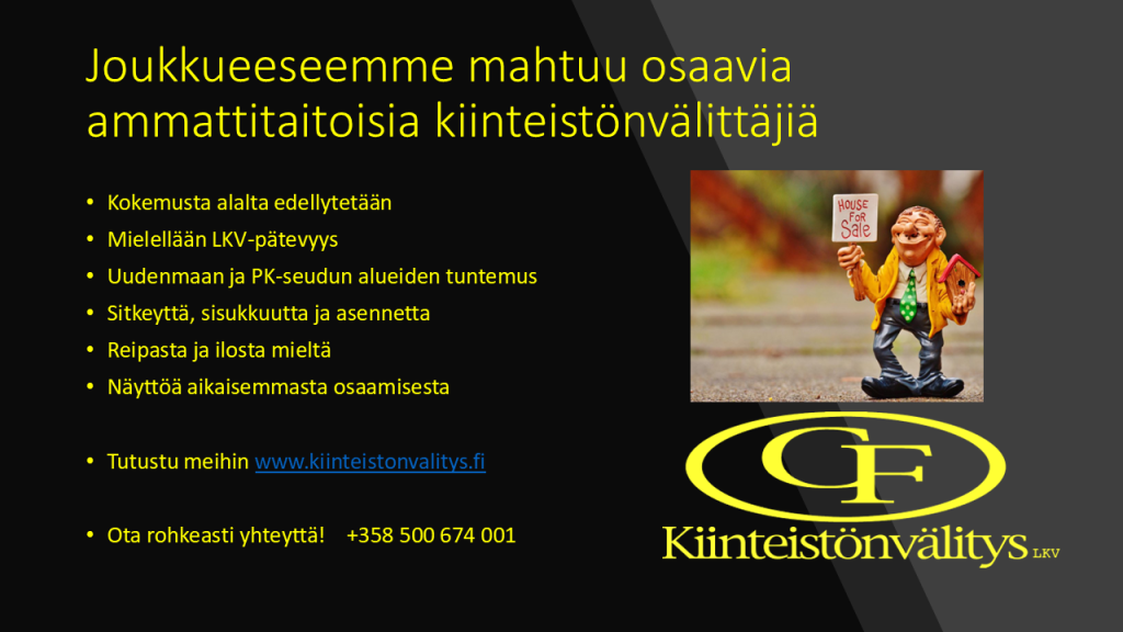 YHTEYSTIEDOT CF Kiinteistönvälitys LKV YHTEYSTIETOMME EMAIL: espoo@kiinteistonvalitys.fi PUHELIN: +358 500 674 001 OSOITE: Keilaranta 1, 02150 Espoo Klikkaa tästä ja tutustu tietosuojaselosteeseen OTA YHTEYTTÄ, KUN HALUAT OSAAVAN JA AMMATTITAITOISEN VÄLITYSLIIKKEEN Please enable JavaScript in your browser to complete this form.Valitse arviokäynnin aihe tai kirjoita viestin aihe omalle rivilleKiinteistön arviokäyntiAsunto-osakkeen arviokäyntiVuokrauspalveluNimi *FirstLastSähköposti *EmailConfirm EmailPuhelin *Viestin aiheKirjoita viestiOlen tutustunut ja hyväksyn tietosuojaselosteen *HyväksyMessageLähetä viesti 19 VUOTTA AMMATTITAITOISTA KIINTEISTÖNVÄLITYSTÄ CF KIINTEISTÖNVÄLITYS LKV Keilaranta 1, 02150 Espoo Puhelin : +358 500 674 001 Email: espoo@kiinteistonvalitys.fi
