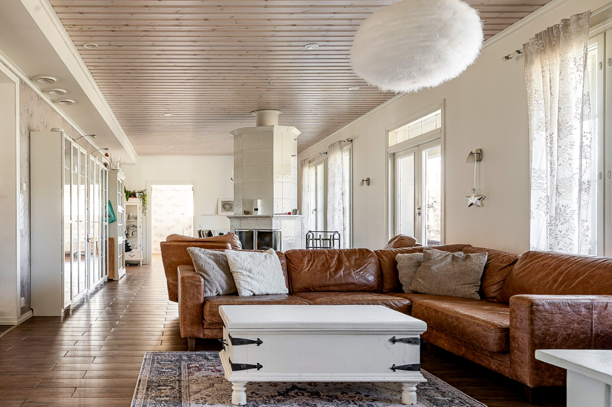 kauniin varaavan takan loimussa. Tila jatkuu saumattomasti suurelle terassille, joka kutsuu nauttimaan kesäpäivistä ja
