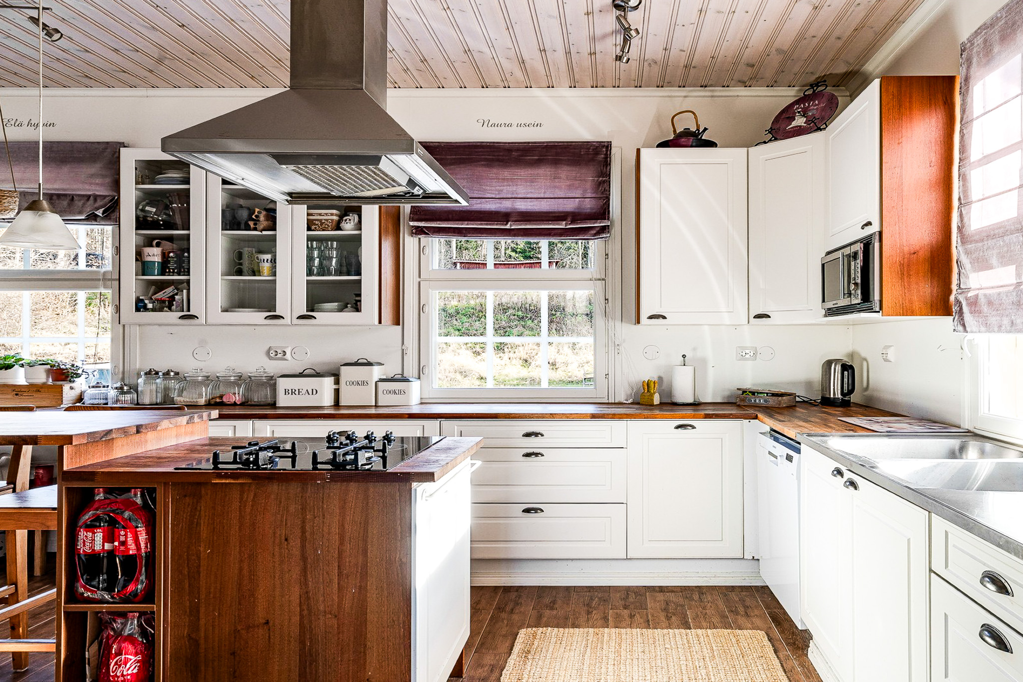 lasten iloinen puheensorina. Keittiössä on tilaa kaikille, ja aamiaisen jälkeen avaatte olohuoneen lasiovet valtavalle
